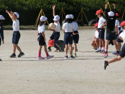 【写真「やったぁ!得点だぁ!」:キックベースボールで盛り上がりました。3年体育の授業風景から】