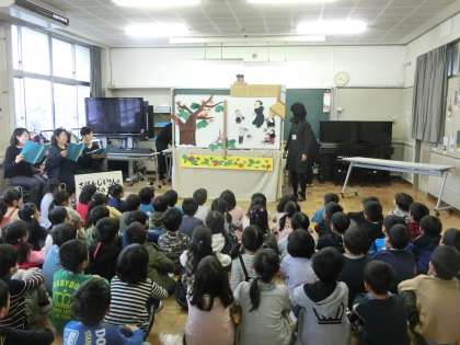 1年生は大喜び。とてもとても楽しい時間を過ごしました。題名は「ざぼんじいさんのかきのき」です。ざぼんじいさんが意地悪でやっていることを、そんな風には受け取らず何でも楽しんでしまう、まあばあさん。ついには我を忘れたざぼんじいさんが大切な柿の木を切ってしまい……。本格的な語りと演出に1年生は瞬く間に熱中し、すぐに物語の世界に浸りました。いじわるじいさんが改心すると会場には穏やか空気が流れました。