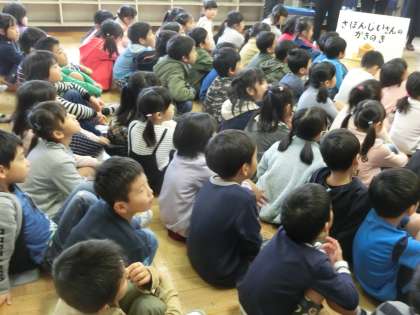 今朝は、ぽけっとクラブのみなさんによる読み聞かせがあり、1年生全員が多目的室に集合しました。いつもはメンバーさんが各教室をまわられて読み聞かせを行っていただきますが、今回は逆に聞き手が全員会場に集まったのです。