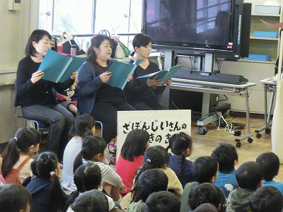 内容もパワーアップです。メンバー全員で分担して、パネルシアター式でお話をしていただきました。小道具はすべて手作り。時間をかけてこつこつ準備していただきました。