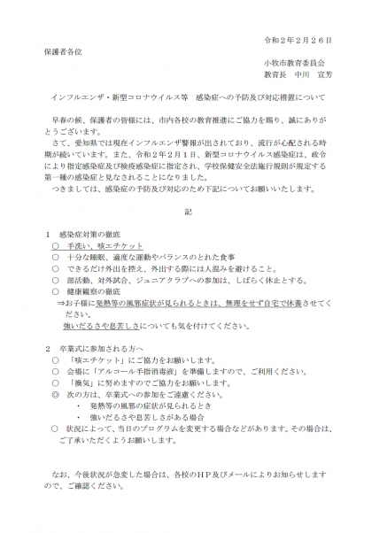 つきましては、本日、小牧市教育委員会より、感染症の予防及び対応について保護者向けの文書が配布されました。(お子さんが持ち帰る文書・ホームページ配布文書にても確認していただくことができます。)