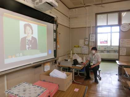 子どもたちは、教室のスライド写真で新しい先生方の顔を見ながら、校長先生のお話を聞きました。