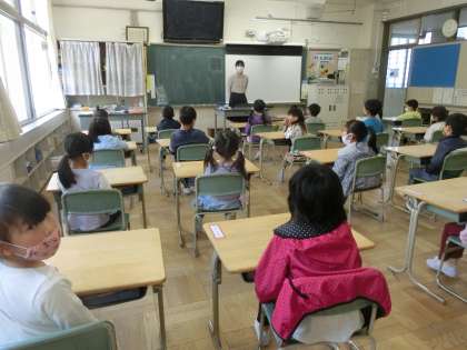 地震が起きたときの教室での避難の仕方や避難経路について、教室で確認しました。実際の訓練でも、「お・か・し・も」の合い言葉を守って真剣に取り組むことができました。
