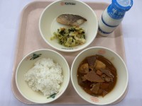 【今日の献立】 ごはん 牛乳 かきたま汁 さばのカレー焼き 千草あえ