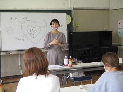 参加者は事前に3重のハートに色を塗って持参し、それを見ながら先生の話を聞きました。
