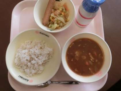 【今日の献立】 麦ごはん 牛乳 きのこ入りカレー ウインナー 福神サラダ