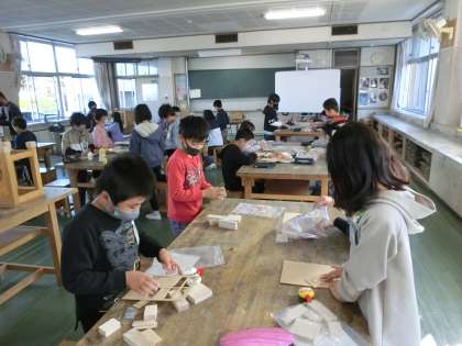 木をつないで作品をつくります。色がぬりやすくなるように、まずはやすりがけです。