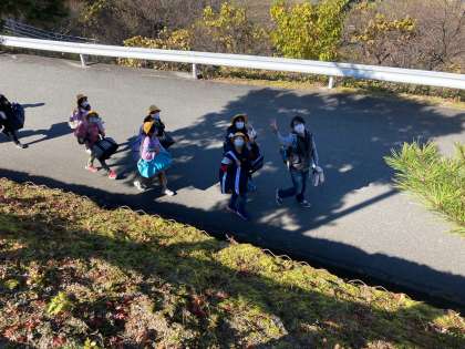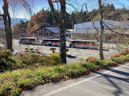 山道に揺られ、紅葉の広がる景色を眺めているうちに自然の家に到着しました 澄んだ空気の中、暖かな日差しが差し、とてもよい天気です