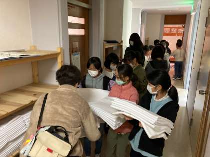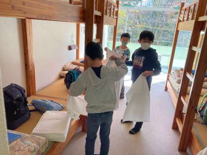 それぞれの部屋に入り、避難経路の確認やシーツの受け取りをしています
