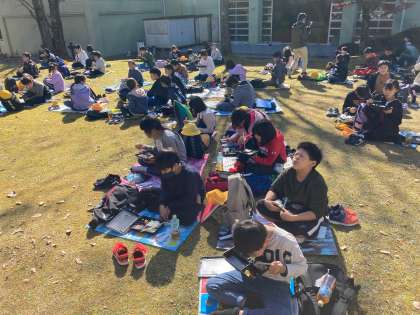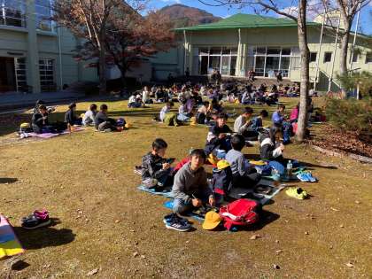 つどいの広場にレジャーシートを敷いて、お弁当の時間です 声を出さずに一方を向いていただきます