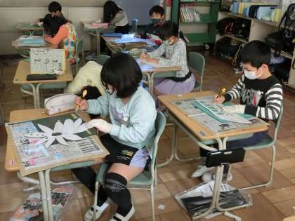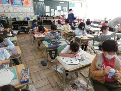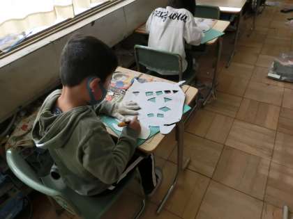 カッターナイフを使って、形を切り抜いていきます。カッターナイフの持ち方や手を置く位置に注意して取り組みました。