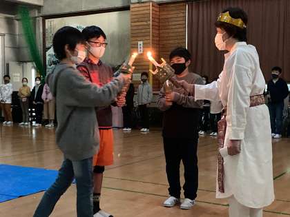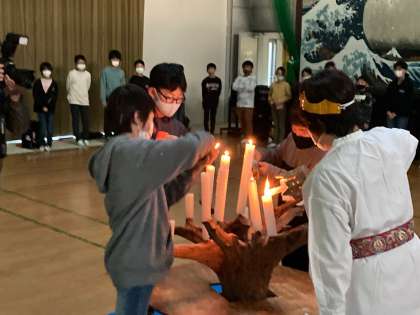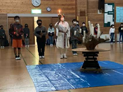 遠き山に日は落ちて♪が流れる中、火の神と火の使いが入場しました 火の神のお言葉があり、火の使いに分火され、その火が中央のキャンドルツリーに点火されました