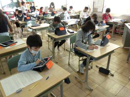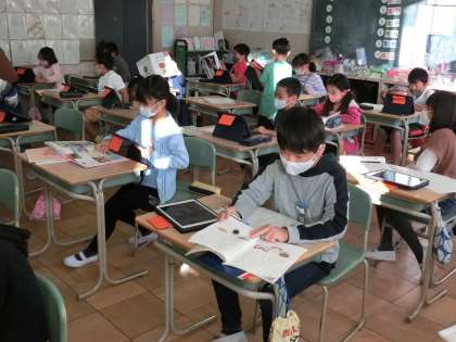 食べ物について書かれた本を読み、伝えたいことをまとめています。わかりやすく伝えるため、まとまりをつくったり例をあげたりします。