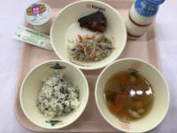 愛知の米粉入りパン 牛乳 コーンクリームスープ ウインナーのケチャップソースがけ 花野菜サラダ