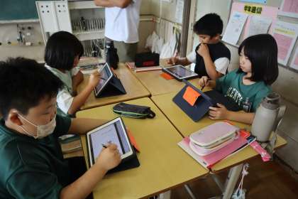 タブレットの判定はとても厳しく、書き順はもちろん、字のバランスや大きさもしっかり書けていないと×になってしまいます。みんな苦戦しながらも楽しく漢字学習に取り組んでいました。