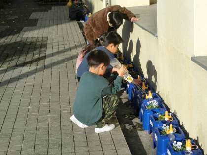 寒い朝でもみんな元気にビオラとチューリップの