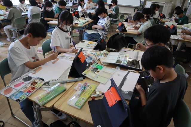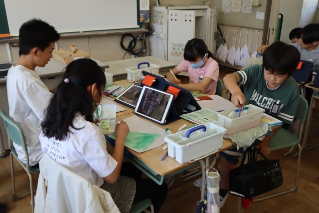 学校のお気に入りの場所の風景画を描くために、様々な場所で構図を考えています。