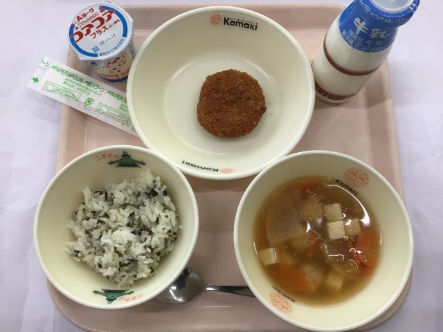 【今日の献立】わかめごはん 牛乳さけだんご汁キャベツ入りメンチカツヨーグルト