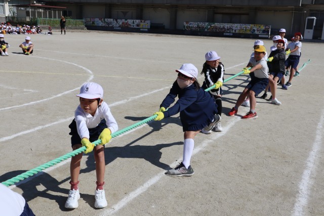 今日は綱引きの練習です。力と息を合わせておもいきり綱を引きます。かけ声をかけたり...