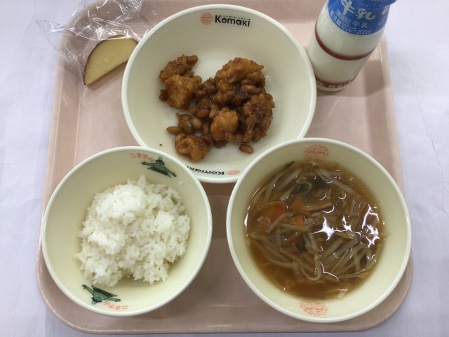 【今日の献立】ごはん 牛乳フォーと野菜のスープ鶏肉と大豆のごまがらめりんご