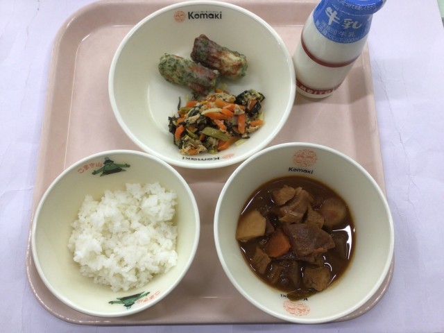 【今日の献立】ごはん 牛乳煮みそちくわの磯辺揚げこまつなとツナの和風いため