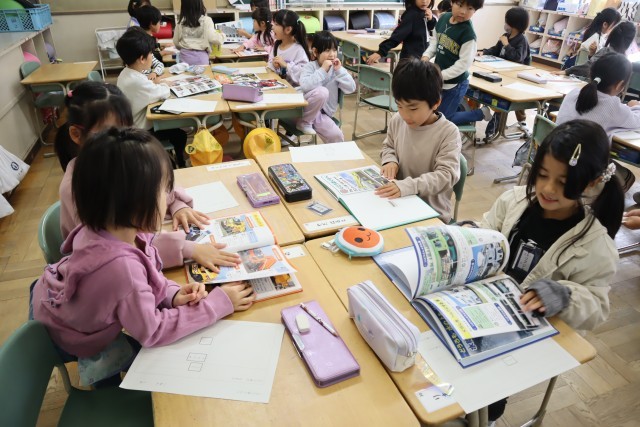 1年生は1組は働く車を調べて、プリントにまとめていました。2組は三角形を組み合わ...