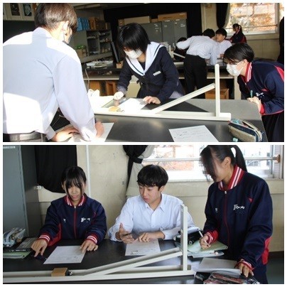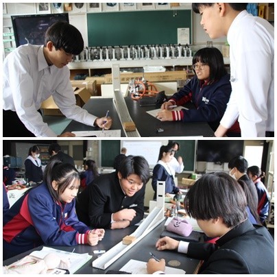 小球を転がして木片に衝突させたときの木片の移動距離を調べました。