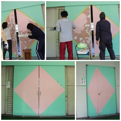 3年生の奉仕作業、体育館の扉のペンキ塗り。
