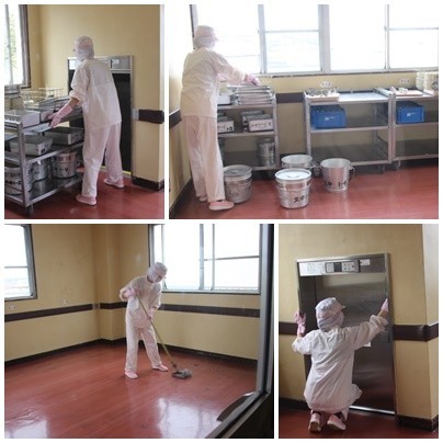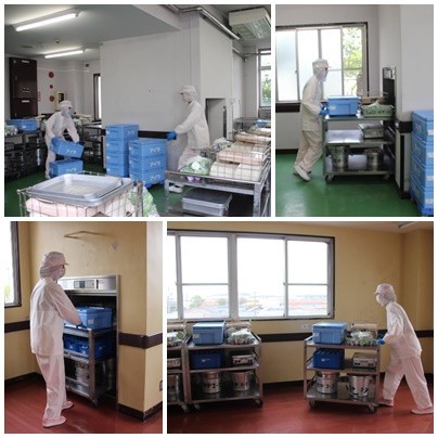 配膳室を清潔に保ち、みんなが安心して給食をいただけるように、きびきびとお仕事されています。