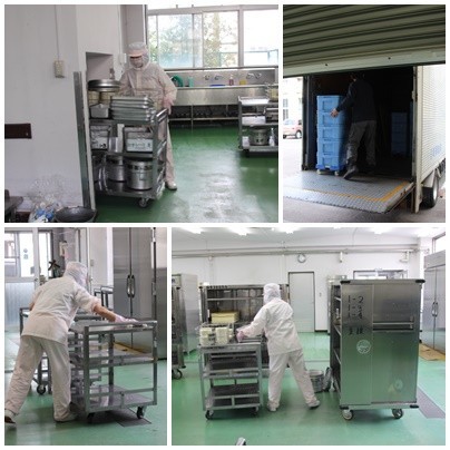 北里中では2名の配膳員さんが給食の準備をしてくれています。