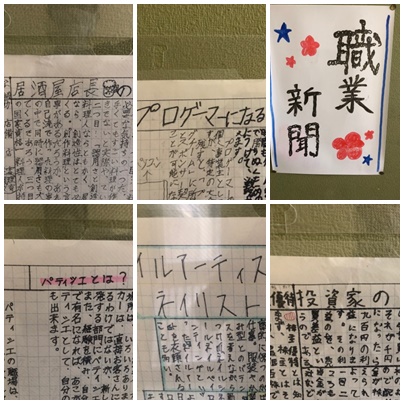 将来の自分、世の中への視野関心を広げ、役に立つ仕事、やりがいのある生き方について考えています。どんな仕事があるのか、興味のある職業について調べ、新聞にまとめました。