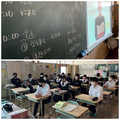 始業式、オンラインで実施されました。心で聴く、そんな姿勢が伝わってくる各教室の様子でした。学年代表の話も素敵で「うさぎとかけまして・・・」とアイディアも豊かに決意表明することができました。