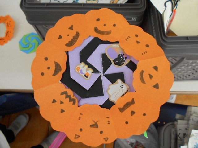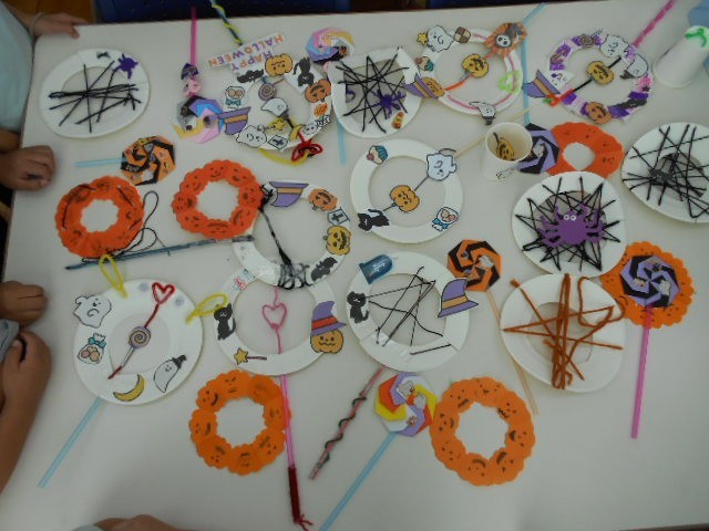 紙皿を切り抜いて飾りをつけたり、折り紙を組み合わせたりして、さまざまなキャンディーができあがりました。