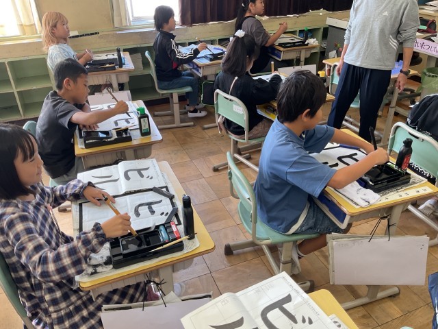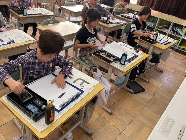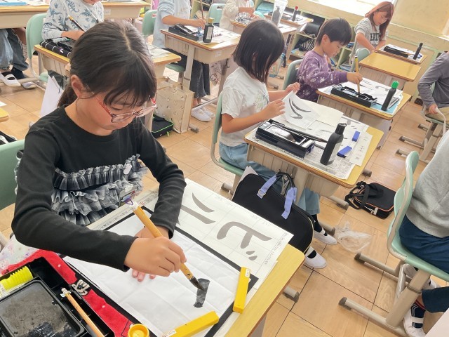 3年 書写 公開日 2025/10/30 更新日 2025/10/30 3年生の部屋 習字で、初めてカタカナを書きました。曲がりや折れの筆遣いに気をつけながら書きました。濁点の細かな動きも集中して書くことができました。 授業風景