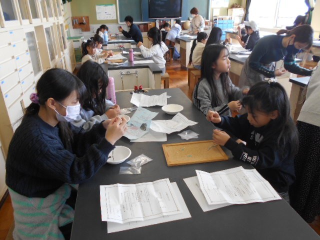 小木小学校では、「防災グッズ」「レジンアクセサリー」「ビーズアクセサリー」「オーヨコスイ(おにごっこ)」「古代火おこし」の5つの講座がありました。