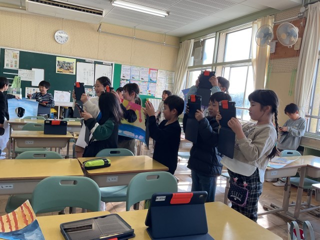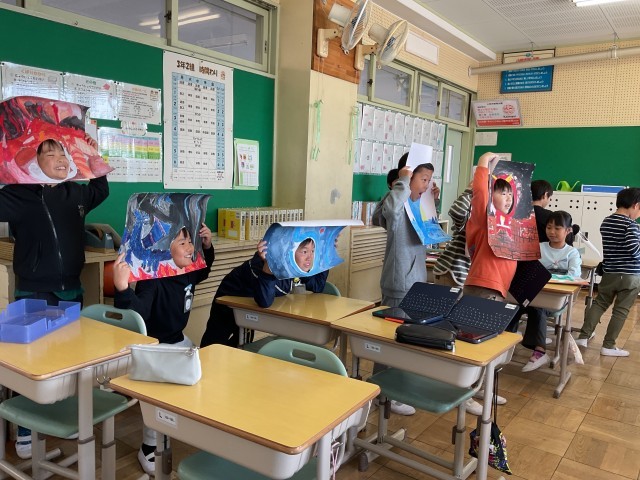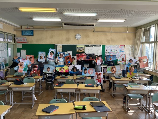 図工で、自分の顔が作品の一部になる絵を作りました。久しぶりのカッターナイフだったので復習して、丸く切りました。どんな表情をしたらよいかを考えて、写真をタブレットで撮りました。