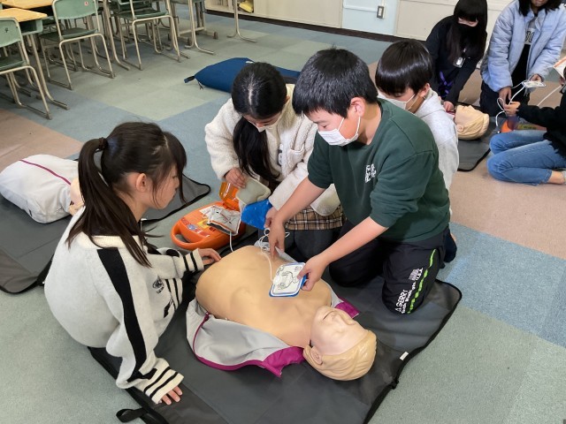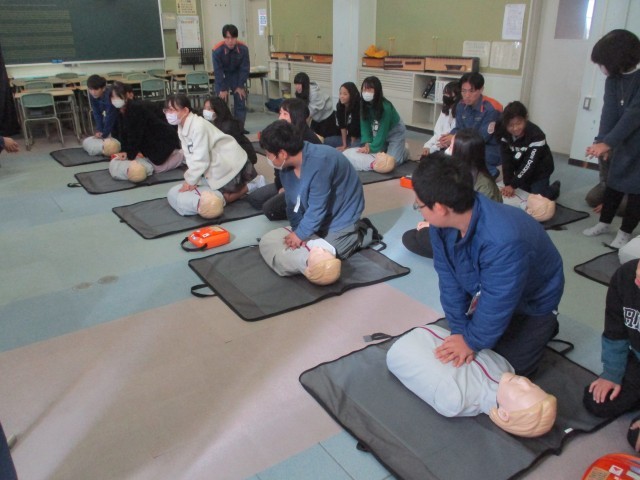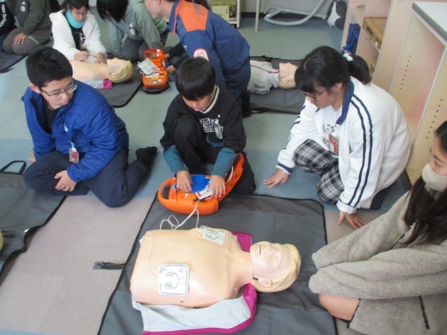 小牧市消防本部の方々に救命救急について教えていただきました。胸骨圧迫の方法や、AEDの使い方を実践を通して学びました。命を救うための知識を身に付けるとともに、知識だけでなく行動する勇気が必要だと気付くことができました。