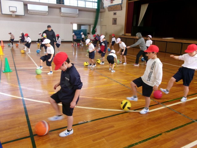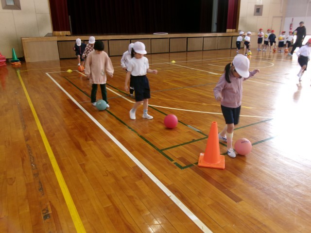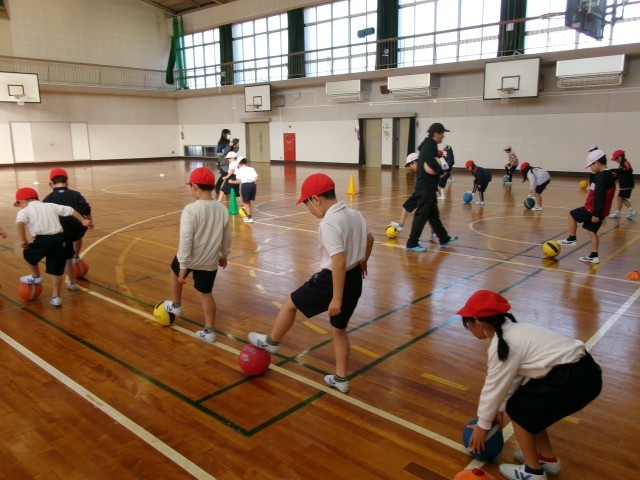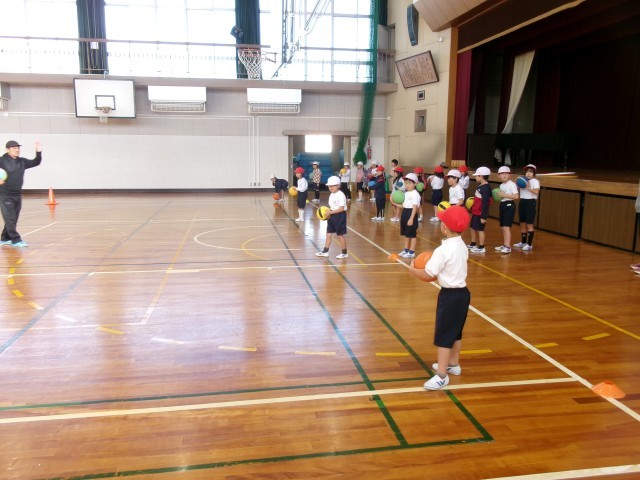 1年生はボールを使って、いろいろな動きに挑戦していました。