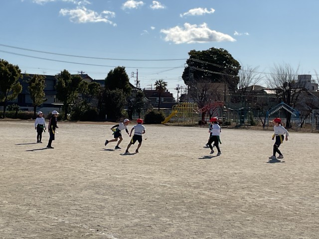 3年 タグラグビー 公開日 2026/01/26 更新日 2026/01/21 3年生の部屋 体育でタグラグビーというボールを使ったゲームをしています。後ろにパスをすることやタグを取られたらパスをするルールを学習し、グループで作戦を考えています。友達同士、声を掛け合いながら楽しくゲームに取り組んでいます。 授業風景