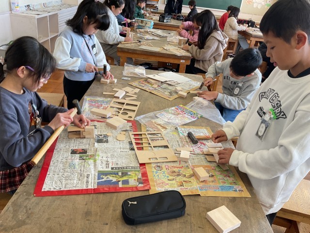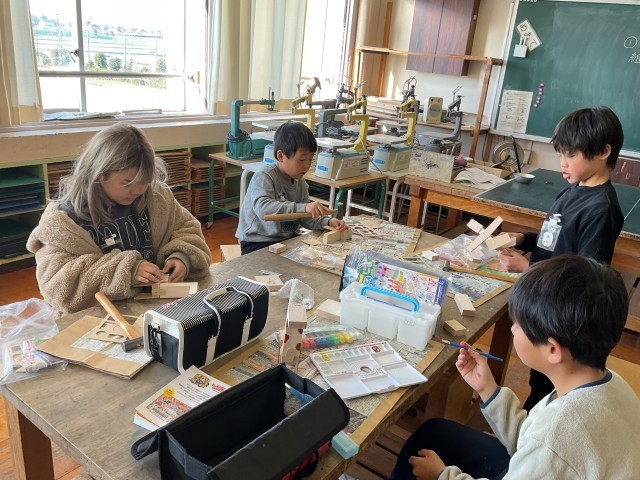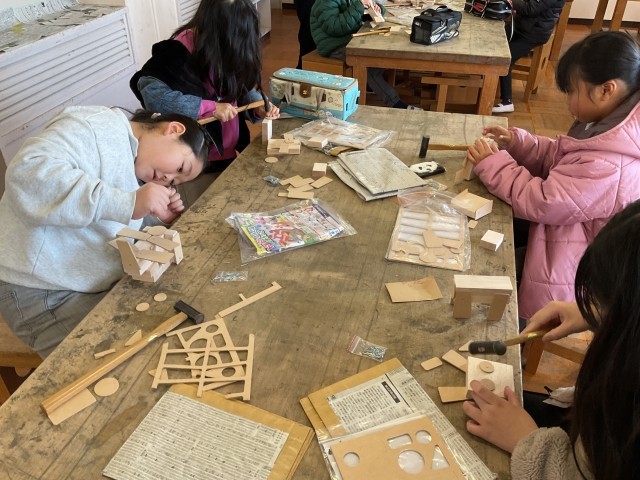 金づちの使い方を知り、木に釘を打って作品を作っています。木のパーツの組み合わせを工夫したり、釘を打って固定するのか動くようにするのかを考えたりしています。指をケガしないように気をつけながら活動しています。木にやすりをかけてから、絵の具を工夫して塗っています。