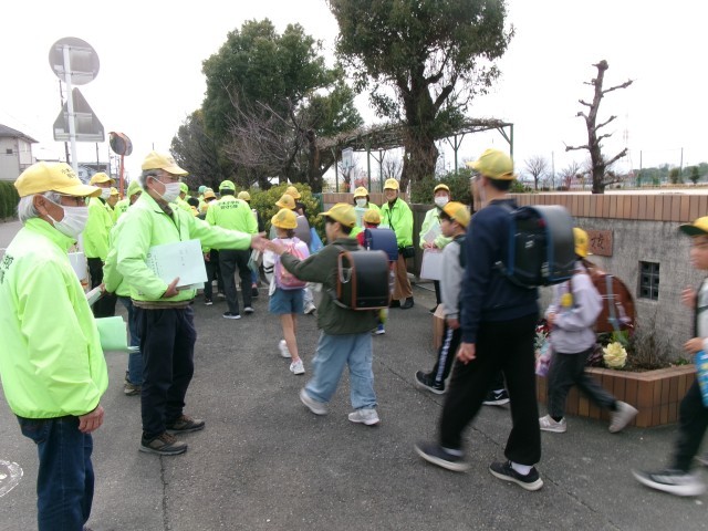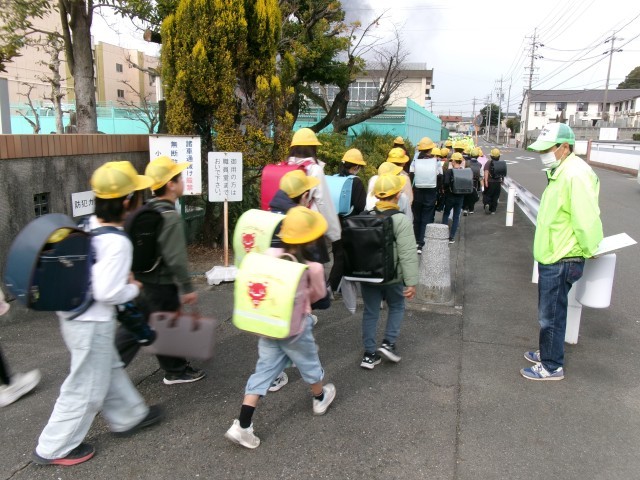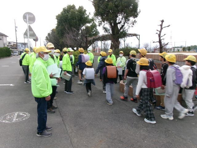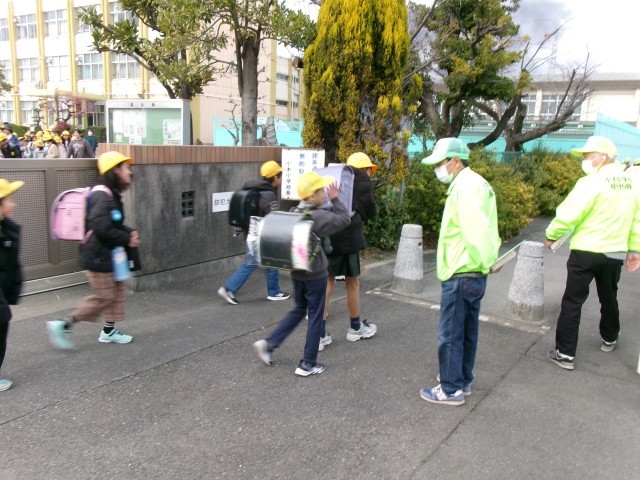 感謝の会の後、パトボラさんに見守られての下校です。