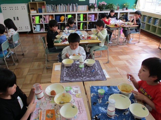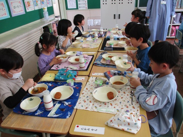 1年生 はじめての給食 公開日 2026/04/21 更新日 2026/04/20 1年生の部屋 今日から給食が始まりました。小学校初めての給食はカレーライス!当番も自分たちでやって、みんなでおいしくいただきました。