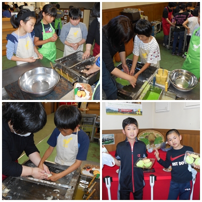 野外学習最後のプログラムのサンプル体験です。溶かしたロウでレタスと天ぷらを作りました。