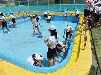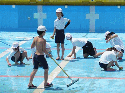 プール清掃 公開日 2017/05/22 更新日 2017/05/22 6年生の部屋 5・6年生の児童の皆さんがプールの掃除をしてくれました。暑すぎるくらいの天気になりましたが、子どもたちは気持ちよさそうに活動していました。泥だらけだったプールの底から、きれいな水色の床が少しずつ見えてきました。2時間かけて大方きれいになりました。お疲れさま!そして、ありがとう!!