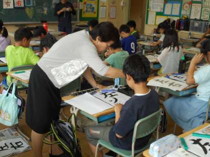 3時間目、外部講師として「志村先生」をお招きし、『左右』の毛筆を練習しました。昨年度もお世話になり、姿勢や筆の持ち方、手本をよく見ることの大切さなどを改めて学びました。「文字」の書き方というよりも「書にのぞむ心の持ち方」の大切さを学んだような気がします。