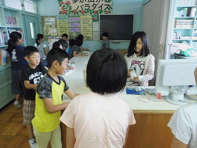 ブックランド(図書室)大盛況 公開日 2017/05/25 更新日 2017/05/25 学校生活の部屋 今日は雨天で運動場が使えないため、20分放課の図書室がにぎわっていました。本を返す人、借りる人でカウンターはずっと行列ができていました。