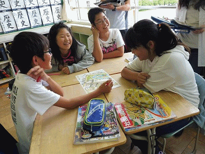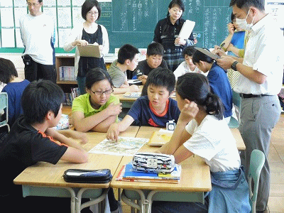 6年2組の番先生が授業を公開してくれました。社会科の歴史単元(平安時代)に関する内容でした。まず、貴族の住まいの絵を見て、気づいたことや疑問などを4人グループで話し合いました。子どもたちは額を寄せ合いながら、自分の気づきをグループの中で仲間に伝えていました。友達の意見につなげて自分の考えを話す児童や、鋭いところに気づく児童もいて、内容の濃い話し合いができました。その後、貴族がどんな文化を生み出したのかを話し合いました。
