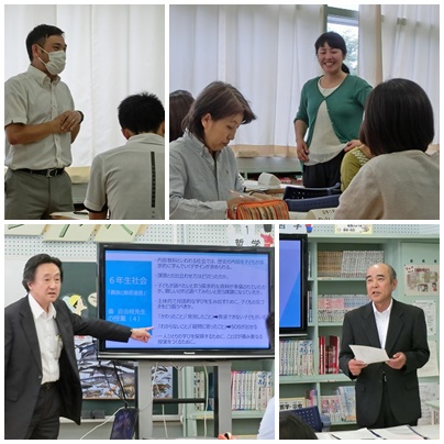 講師に小木小前校長の旭先生、北里小前校長の永井先生をお招きしました。6年2組の授業を見ていただいた後、研究協議にも一緒に参加していただき、指導もいただきました。