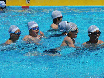 写真は自由時間の様子です。子どもたちはプールの中でとっても気持ちよさそうにしています。