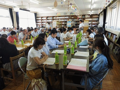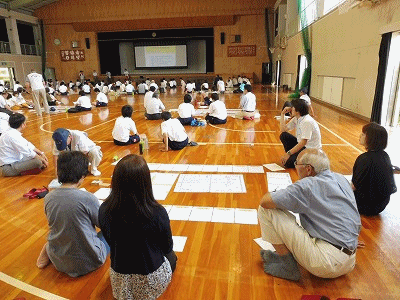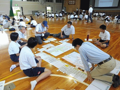 6月17日(土)13時から北里中学校で行われました。小木小からはPTA会長、副会長、母親代表、書記、会計、生活部長、校長、教頭、生徒指導主任の8名が参加しました。校区の児童生徒の様子や気になることなどについて、情報交換をしました。その後、場所を体育館に移して、避難所・運営・ゲーム(HUG)を行いました。校区の大人たちと中学3年生の生徒、北里3校の保護者や教員が参加して、学校が避難所になった場合どのように対応していくのか、ゲーム形式で学んでいきました。
